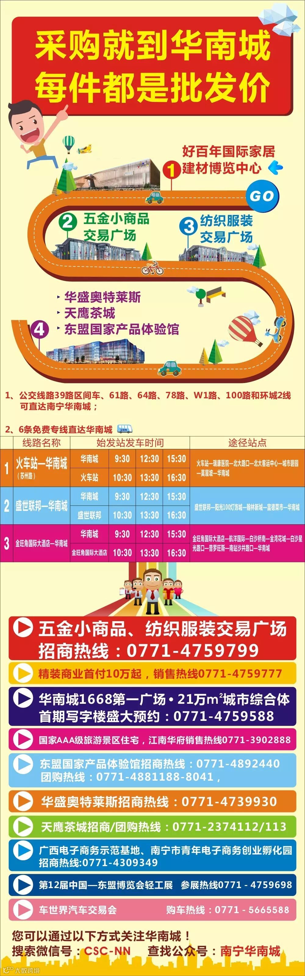 南宁华南城规划总建筑面积488万㎡,是一个集生产、生活配套服务于一体的大型产品展示交易中心、现代综合商贸物流中心和高端生产服务基地。华南城立足南宁、面向西南、服务东盟及世界,为中国、东盟搭建长期展示、交易的商贸服务平台,共同推动自贸区发展。