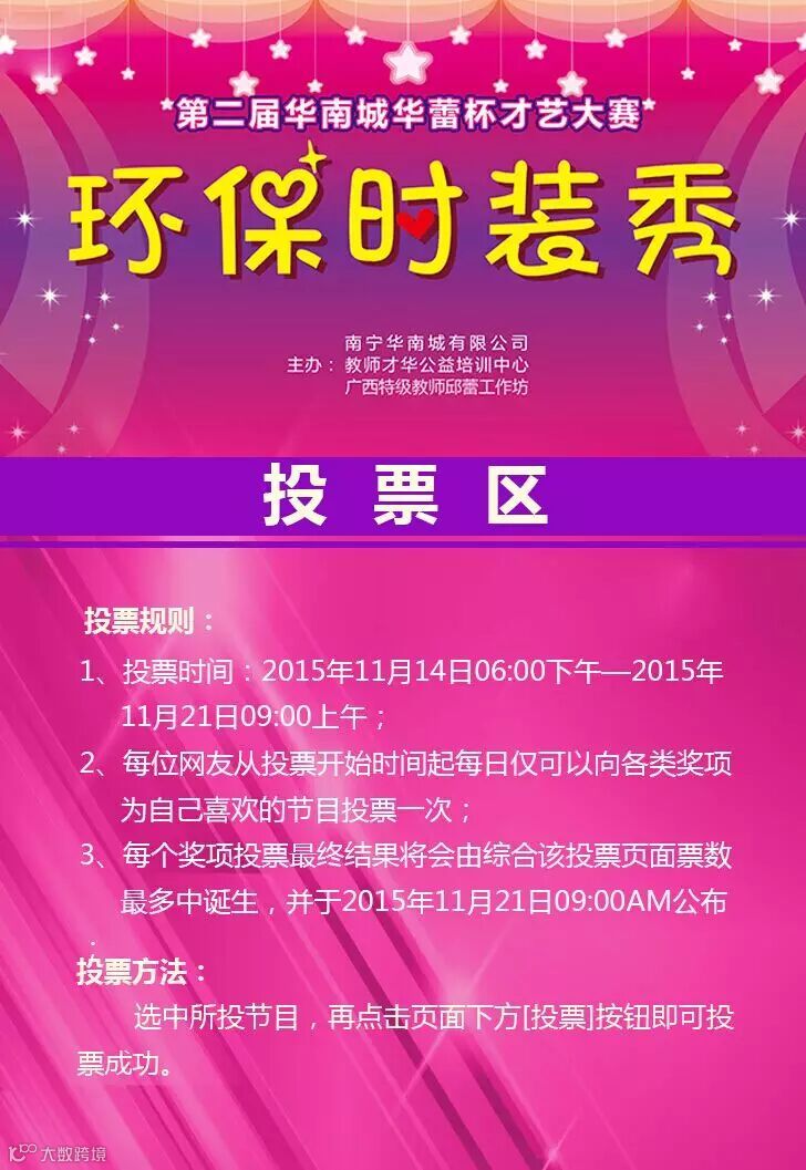 导读:第二届华南城华蕾杯才艺大赛——环保时装秀节目投票开始啦,赶紧为您喜爱的节目投上宝贵的一票吧!我们将从投票票数
