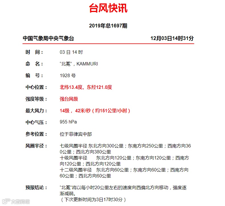 据了解,台风“北冕”于今天(3日)凌晨零点10分前后,在菲律宾中部沿海吕宋岛附近登陆,登陆时中心附近最大风力有16级(55米/秒),中心最低气压为930百帕,超过数十万人被迫转移。