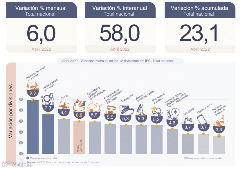 阿根廷录得30年来最高同比通胀率。INDEC(阿根廷国家统计和人口普查局)宣布阿根廷的年际通货膨胀率从55.1%上涨到58%。据报道,月度增幅最高的领域是服装和鞋类。由于物价不断上涨,在阿根廷支付日常开支变得越来越困难。 俗话说:“工资上楼梯,通胀上电梯”。 阿根廷人的口袋不足以面对打击该国的持续通货膨胀的原因。INDEC 5月12日发布的数据证明了这一点。 该机构报告称,与3月份相比,4月份的通货膨胀率为6%,其中包括过去12个月的58%的增长。直到上个月它还是55.1%。