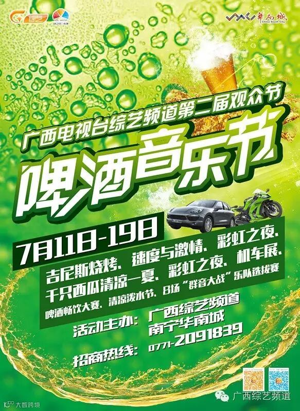 啤酒畅饮大赛送出免费畅饮机会,千只西瓜免费品尝,民谣、爵士、民乐、魔术杂技、字画拍卖四大分会场倾情演出,七场广西综艺“群音大战”优秀乐队选拔赛,更有哈雷等重型机车展示,还有改装车车技秀出速度与激情,篝火狂欢,清凉泼水,开心电玩,醉美华南城·广西电视台综艺频道第二届观众节暨啤酒音乐节7月11日-19日邀您同欢共乐!