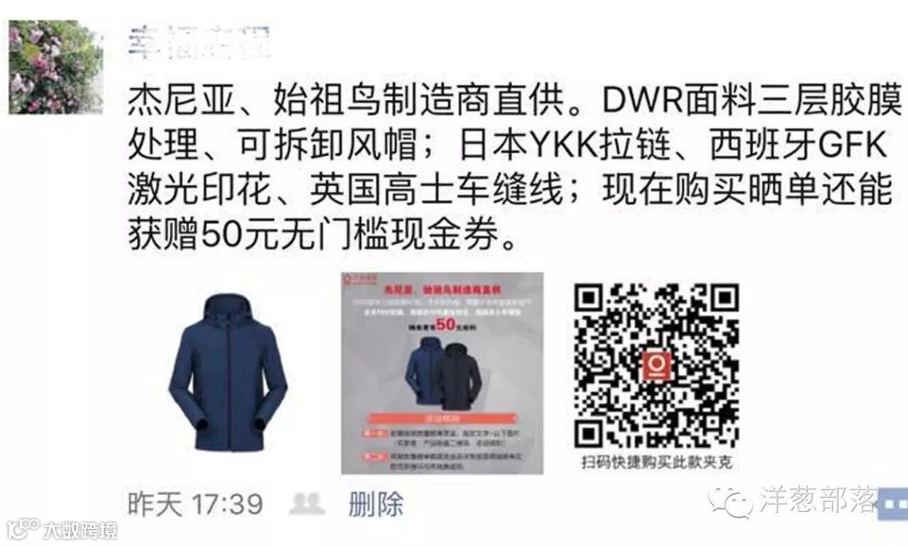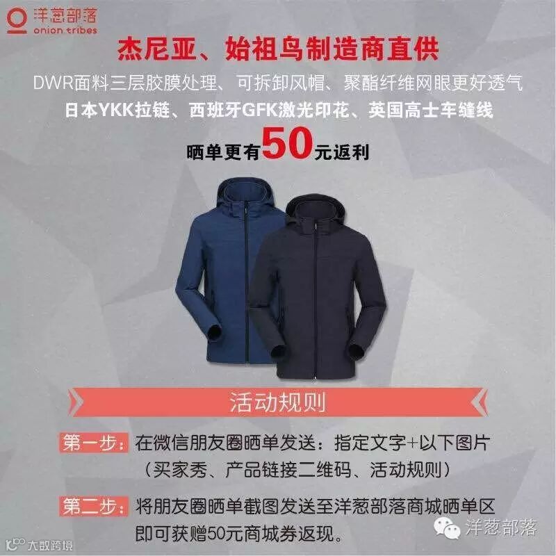 只要将“杰尼亚、始祖鸟制造商直供。DWR面料三层胶膜处理、可拆卸风帽;日本YKK拉链、西班牙GFK激光印花、英国高士车缝线;现在购买晒单还能获赠50元无门槛现金券。”这句话复制到朋友圈,再加上你的晒单图片,活动规则图片和这件产品的二维码,然后,第二步,将你朋友圈这条微信截图发至洋葱部落商城晒单区,就可以获得50元的返现啦~