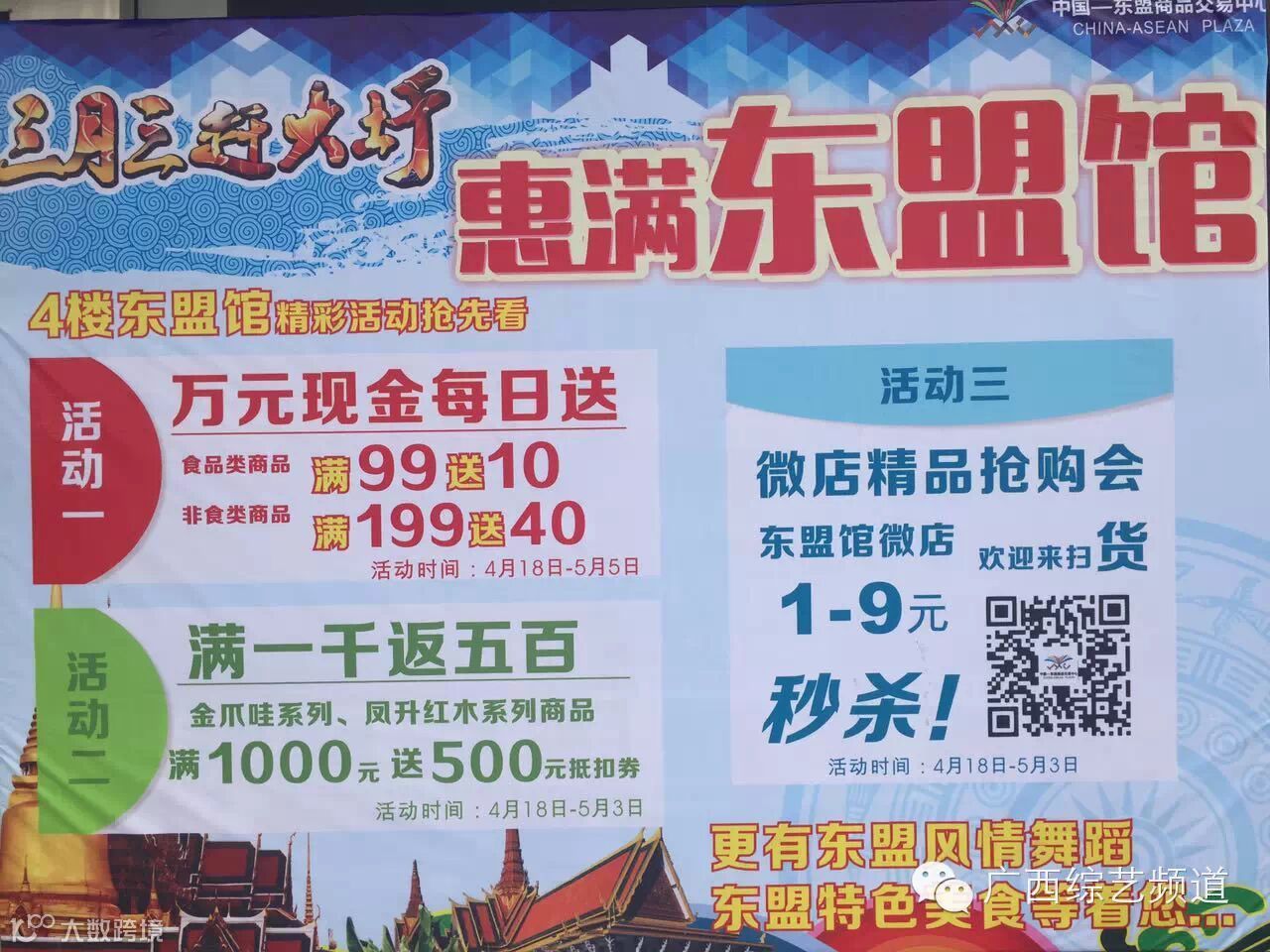 三月三•赶大圩——华南城首届民俗文化商贸节期间,华南城还推出了全城商品促销大狂欢,超低折扣钜惠,万种商品,品种齐全,还有大量的精美礼品送给大家。商贸节期间,在东盟国家产品体验馆开展整点限时半价购,每天15:00、16:00、17:00、18:00四个整点的前五分钟,即可五折抢购限时购区域的商品,同时活动期间在东盟馆购买家具、摆件等商品满一千元以上,即可获得500元的购物卡。在华盛奥特莱斯里,鞋履1折起大型特卖,新春装3折封顶(指定品牌参与);时尚/名品馆特推劲爆款一口价商品;万元购物卡疯狂送,活动期间消费满688元即可免费送一张价值100元购购卡;满百即送500元现金抵用劵,活动期间消费满100元即可凭小票去二楼客服台领取一张500元指定品牌现金抵用劵。