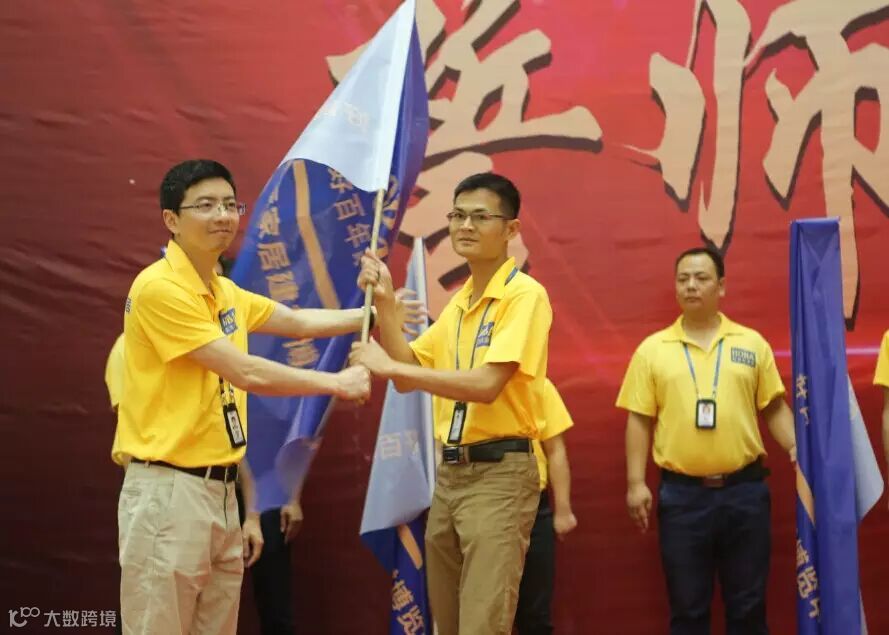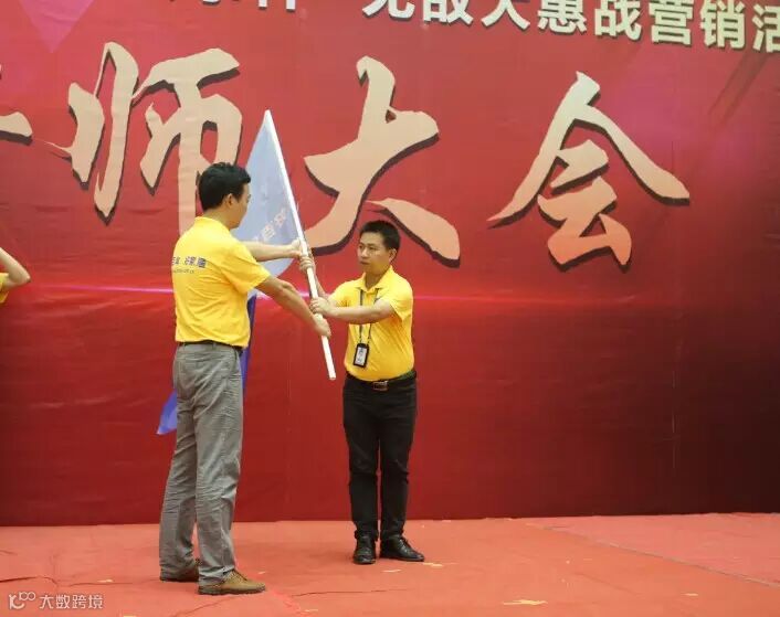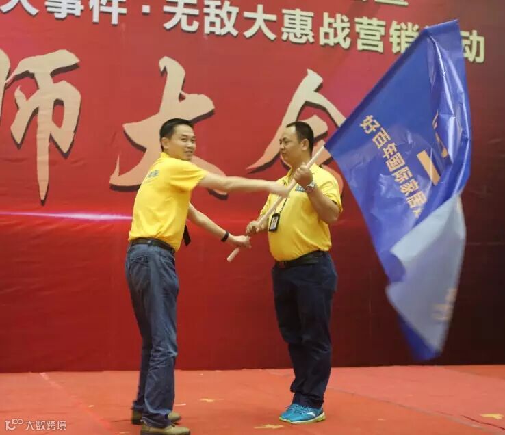 好百年集团副总裁林绍华先生、南宁好百年总经理胡海龙先生、南宁好百年副总经理李政伟先生为现场的好百年战士们以及商户联盟授战旗!