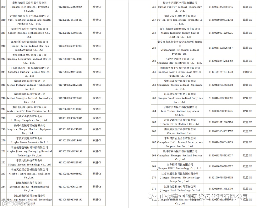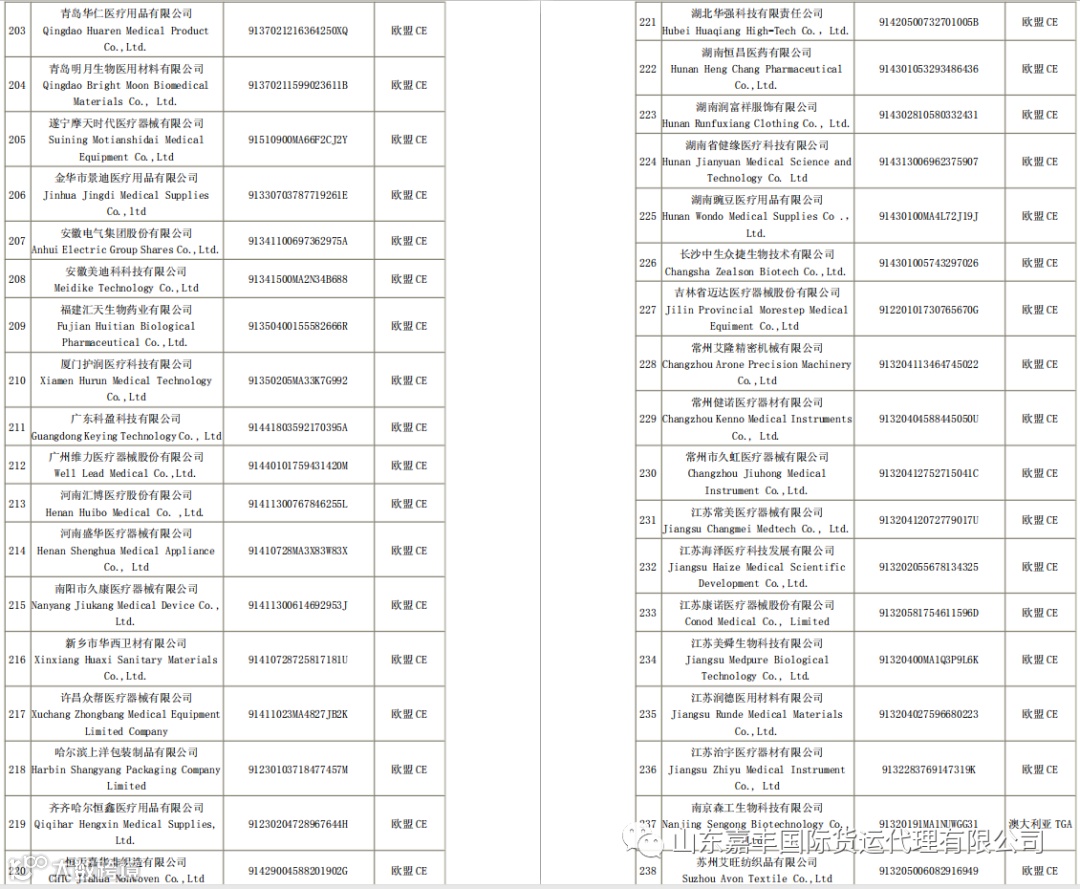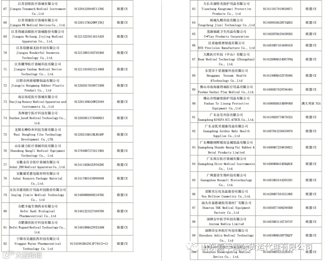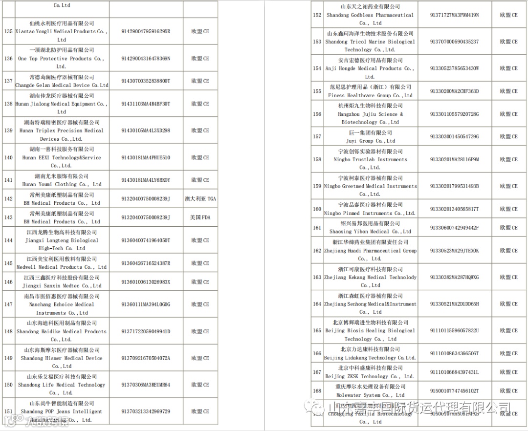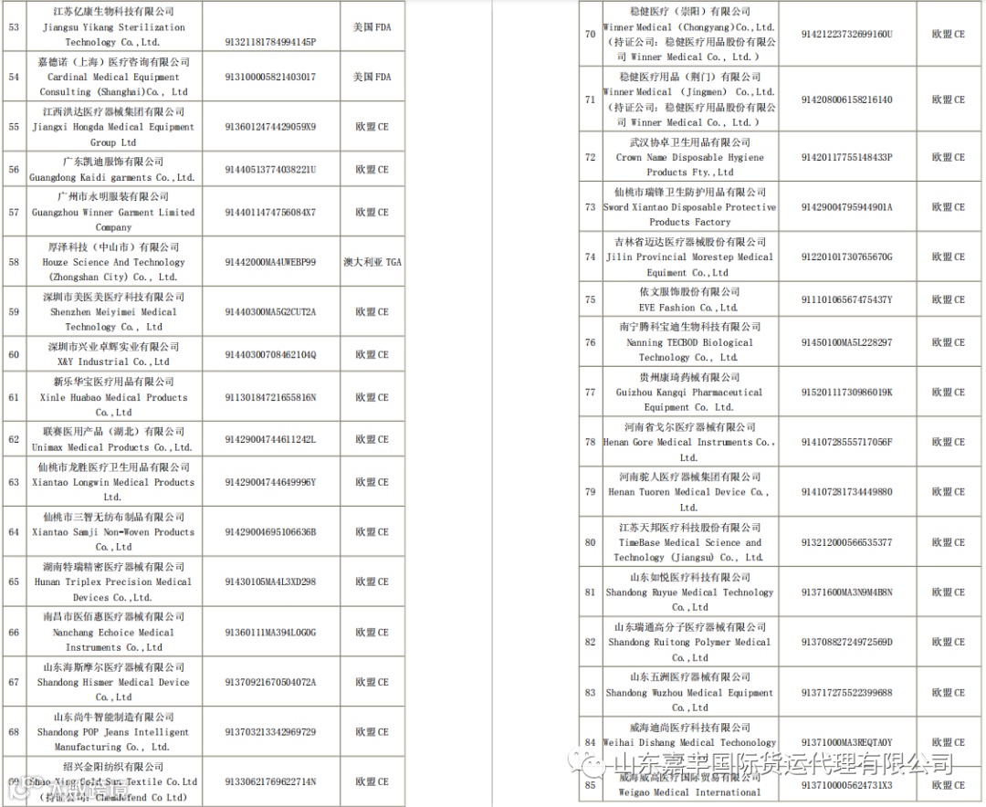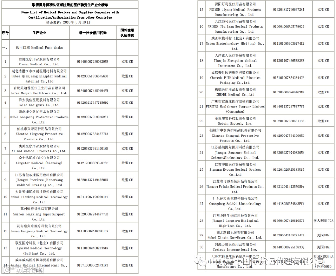 取得国外标准认证或注册的医疗物资生产企业清单