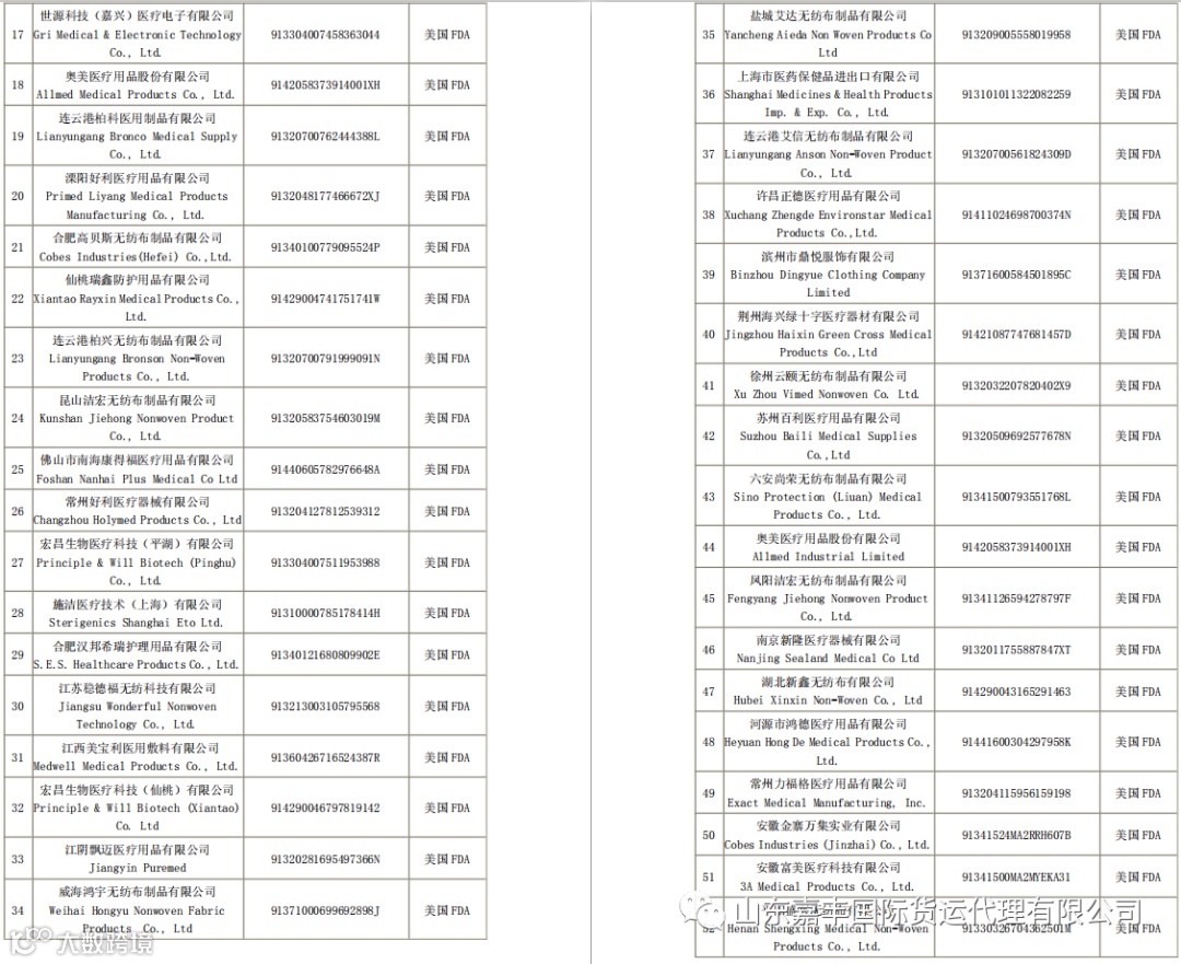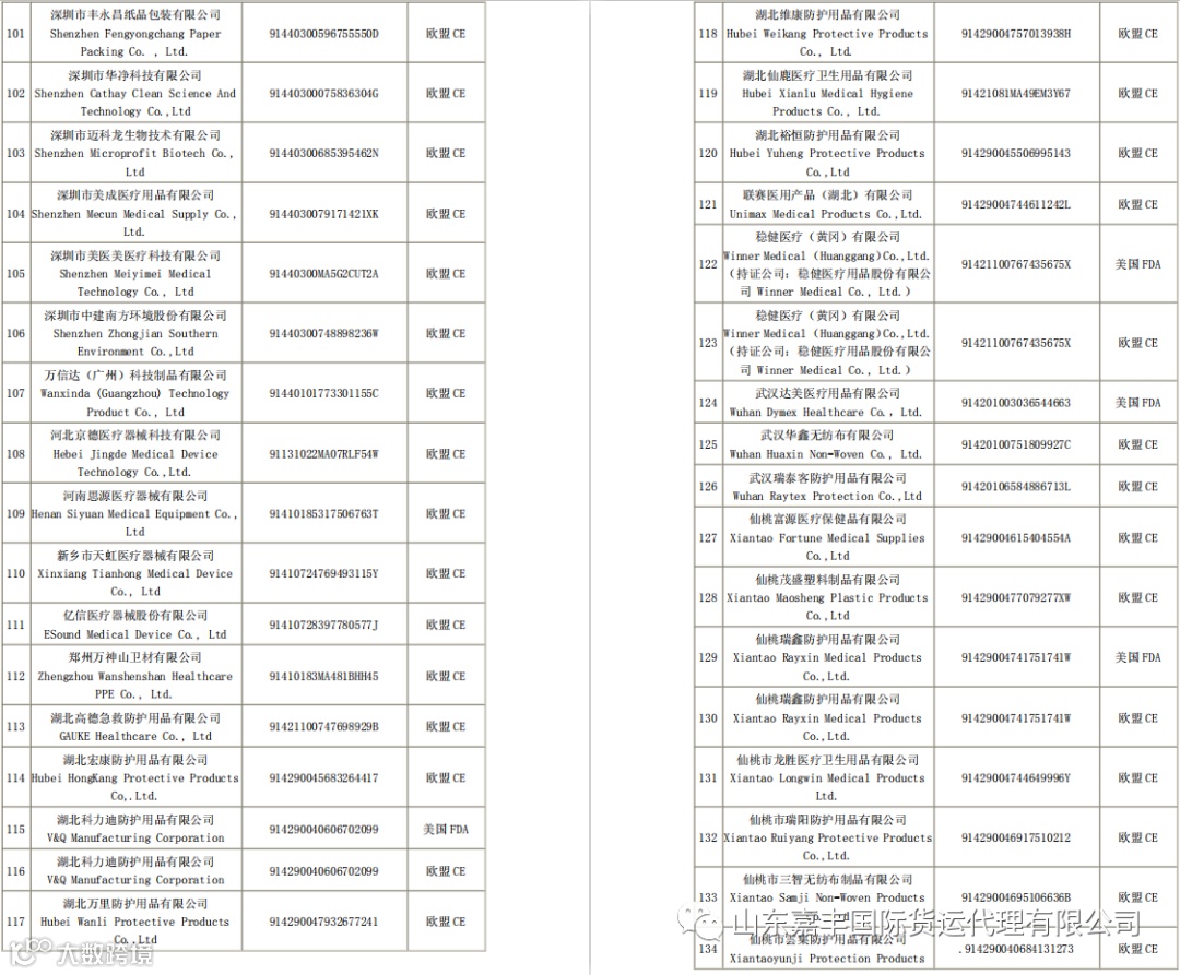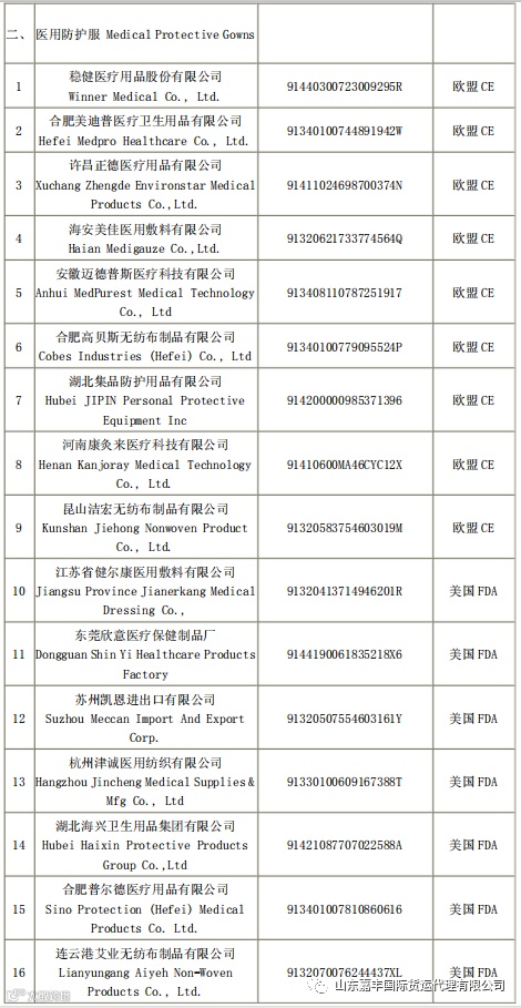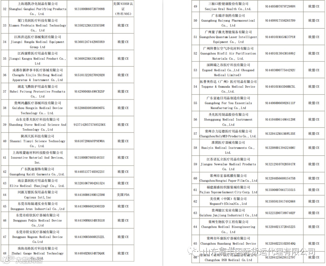 取得国外标准认证或注册的非医用口罩生产企业清单