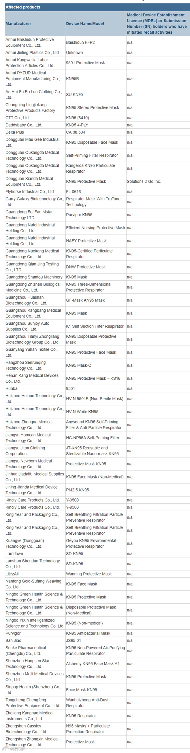 不久前FDA突然在EUA名单中取消了60多家中国制造商在美国销售KN95口罩的许可。5月16日,加拿大发出官方公告,在对部分进口口罩等防疫物资的质量和安全性发出警告的同时,还召回60家不合格企业产品。5月18日,美国疾控中心(CDC)也发布了一批接受检测的口罩及生产商名单,未达到最低95%过滤标准的企业达86家。(注:文中附19日最近更新《取得国外标准认证或注册的非医用口罩生产企业清单》和《取得国外标准认证或注册的医疗物资生产企业清单》)