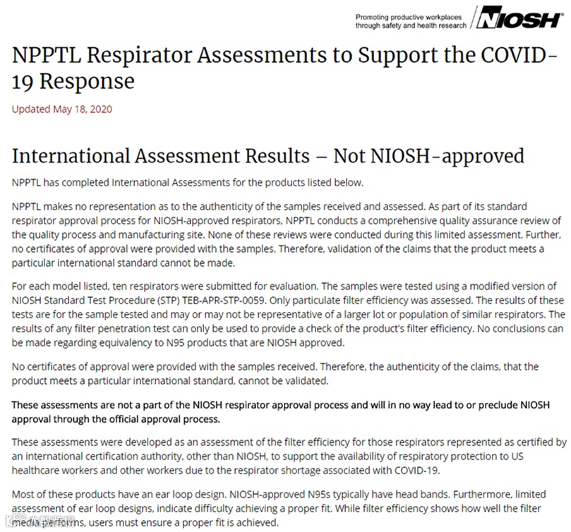 同时CDC表示,这些评估不属于NIOSH审批流程的一部分,也不会导致或阻止NIOSH通过正式审批流程获得批准。制造商、分销商、供应商和进口商不得利用这些结果对其产品进行索赔和/或影响购买者。