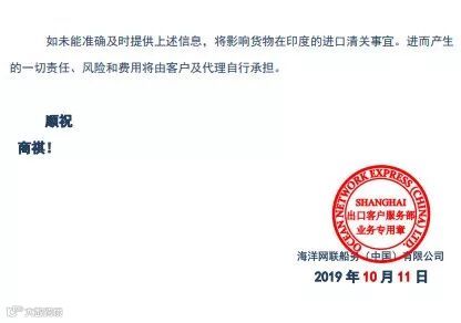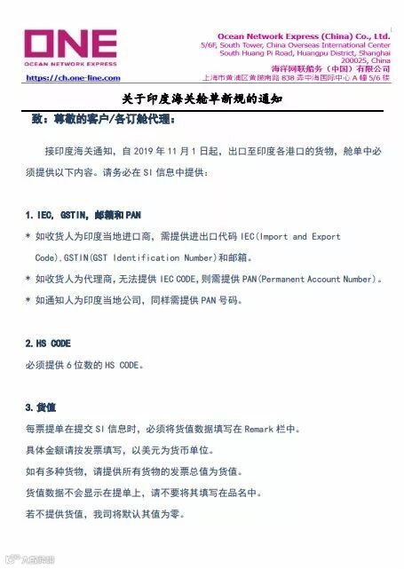 接印度海关通知,自 2019 年 11 月 1 日起,出口至印度各港口的货物,舱单中必须提供以下内容。请务必在 SI 信息中提供: