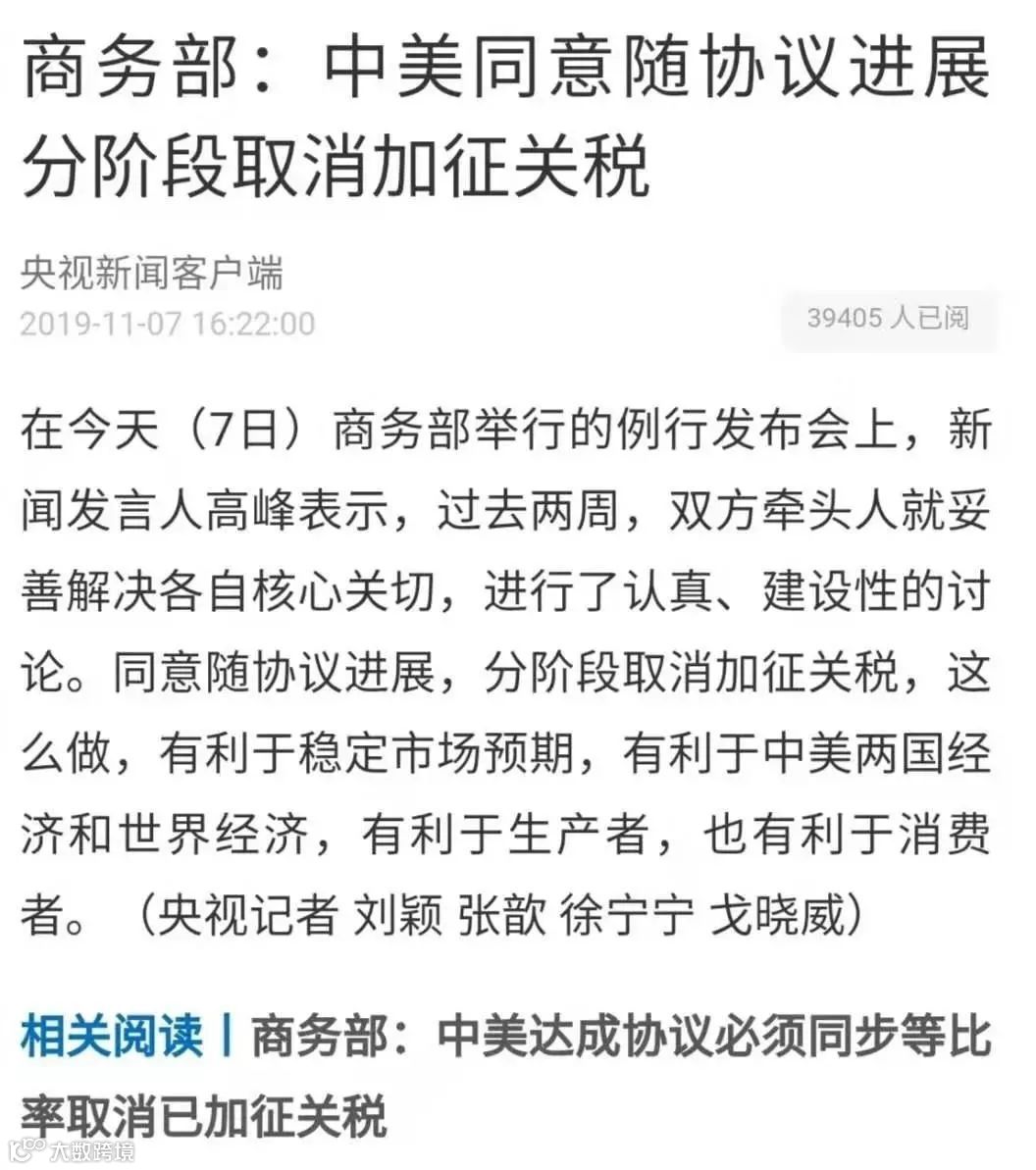 中美贸易磋商取得大进展!商务部传来大消息,人民币汇率暴涨,商务部新闻发言人高峰表示,过去两周中美双方牵头人就妥善解决各自核心关切,进行了认真、建设性的讨论,同意随协议进展,分阶段取消加征关税。中方对于关税问题的立场是一贯的明确的,贸易战由加征关税而起,也应由取消加征关税而止。至于第一阶段取消多少,可以根据第一阶段协议的内容来商定。