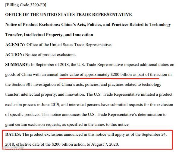 本通知中宣布的产品排除加征有效期为:2018年9月24日至2020年8月7日。美国海关和边境保护局将发布有关货物进境指导和实施排除加征的指示。