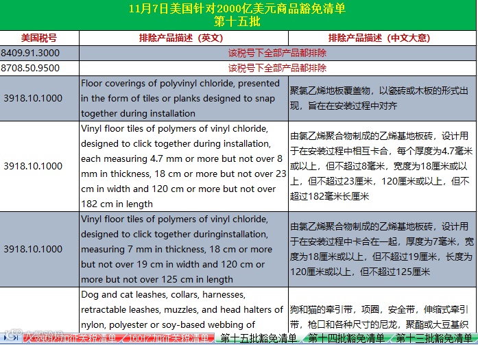美国当地时间11月7日,美贸易代表办公室(USTR)公布了针对中国加征关税商品的第15批商品排除清单,主要涉及2000亿美元加征关税商品中的32个税号36个品类。其中8409.91.3000和8708.50.9500两个税号下所有产品被完全排除。排除有效期可追溯至2018年9月24日(2000亿清单生效之日)。