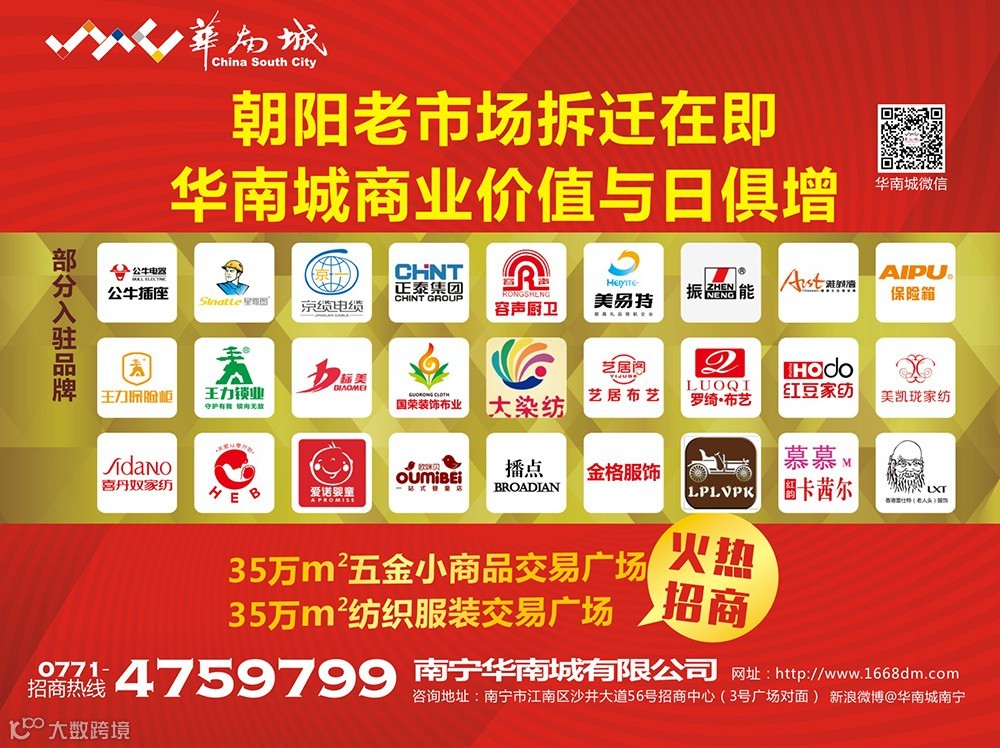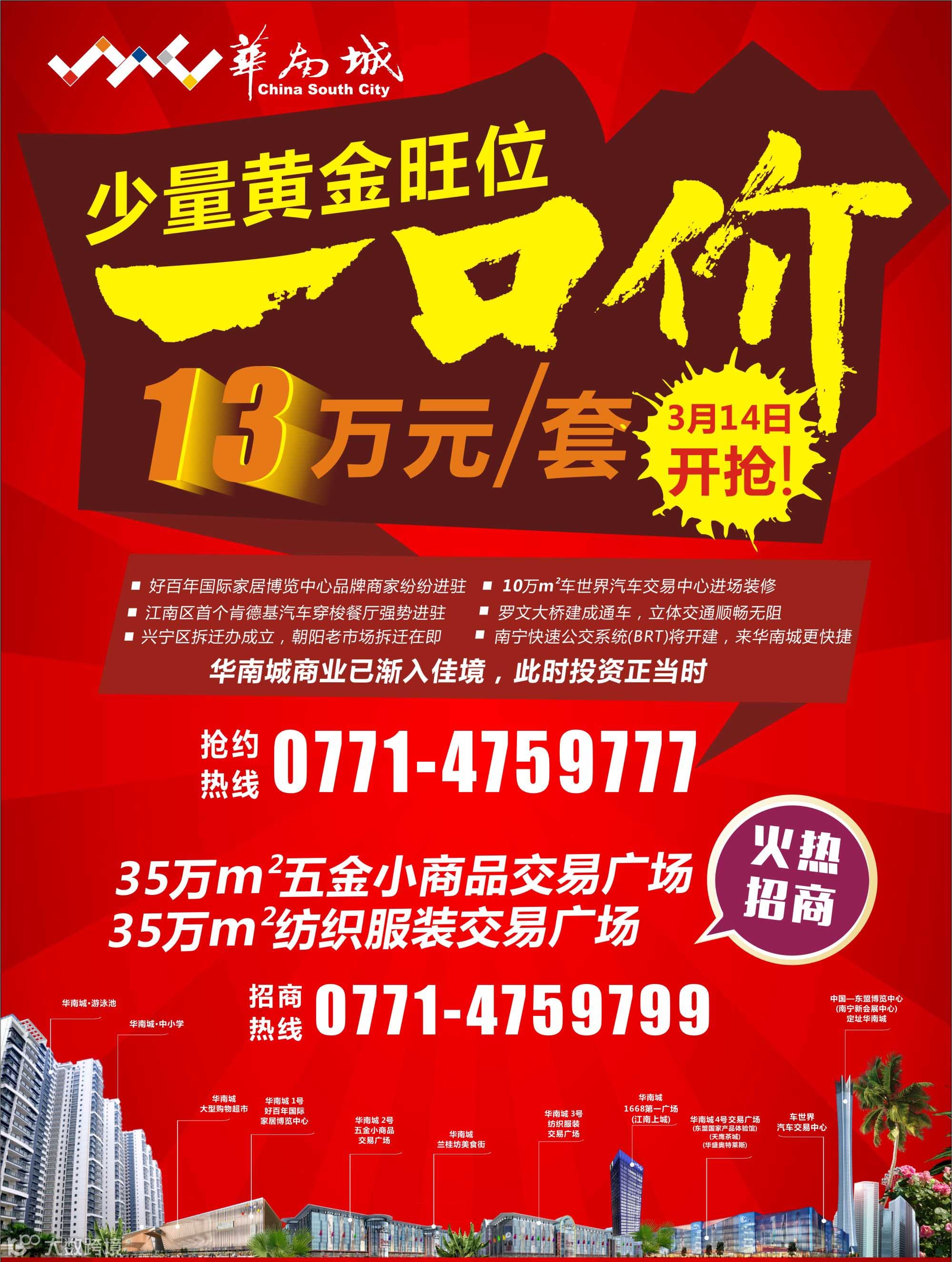 4、488万平方米南宁华南城新会展商业物业,火热招商中0771-4759799;精装商业首付10万起,销售热线0771-4759777;新会展区住宅,江南华府销售热线0771-3902888;中国东盟商品交易中心-东盟国家产品体验馆招商热线:0771-4892440,团购热线:0771-4881188-8041。