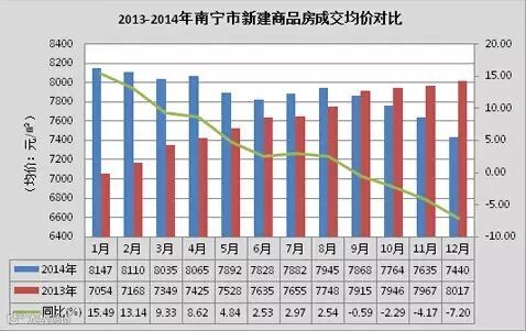 南宁2014年楼市均价7884元/㎡,与2013年整体均价7926元/㎡相比,基本持平。2014年房价曲线持续走跌,1月房价全年最高8147元/㎡,环比上涨2.71%;12月房价最低7440元/㎡,从整年的数据上来看是波动下跌的。