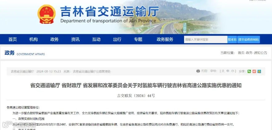 8月12日,吉林省交通运输厅、省财政厅、省发展和改革委员会发布《关于对氢能车辆行驶吉林省高速公路实施优惠的通知》,明确2024年9月1日0时至2026年8月31日24时,安装ETC套装设备的吉林省籍氢能车辆,在吉林省各高速公路收费站间点对点免费通行,相应的高速公路通行费由省财政统一支付。