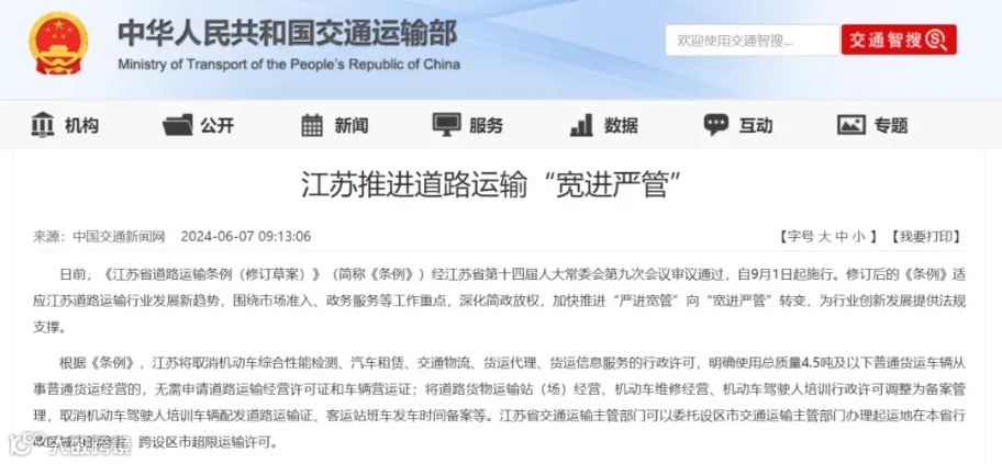 根据《条例》,江苏将取消机动车综合性能检测、汽车租赁、交通物流、货运代理、货运信息服务的行政许可,明确使用总质量4.5吨及以下普通货运车辆从事普通货运经营的,无需申请道路运输经营许可证和车辆营运证。并要求网络货运经营者承担承运人责任,公平参与市场竞争,对运输、交易全过程进行实时监控和动态管理。