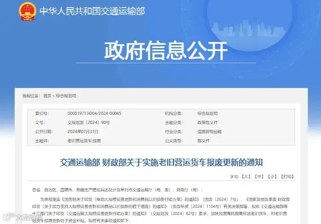 近日,交通运输部、财政部发布《关于实施老旧营运货车报废更新的通知》。本次细则明确对提前报废国三及以下排放标准营运柴油货车、提前报废并新购国六排放标准货车或新能源货车、仅新购符合条件的新能源货车,分档予以补贴,最高可补14万!补贴政策实施期限为本文件印发之日至2024年12月31日。
