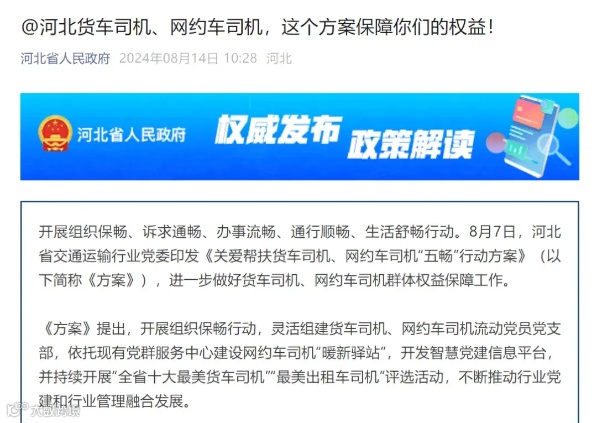 8月7日,河北省交通运输行业党委印发《关爱帮扶货车司机、网约车司机“五畅”行动方案》,进一步做好货车司机、网约车司机群体权益保障工作。
