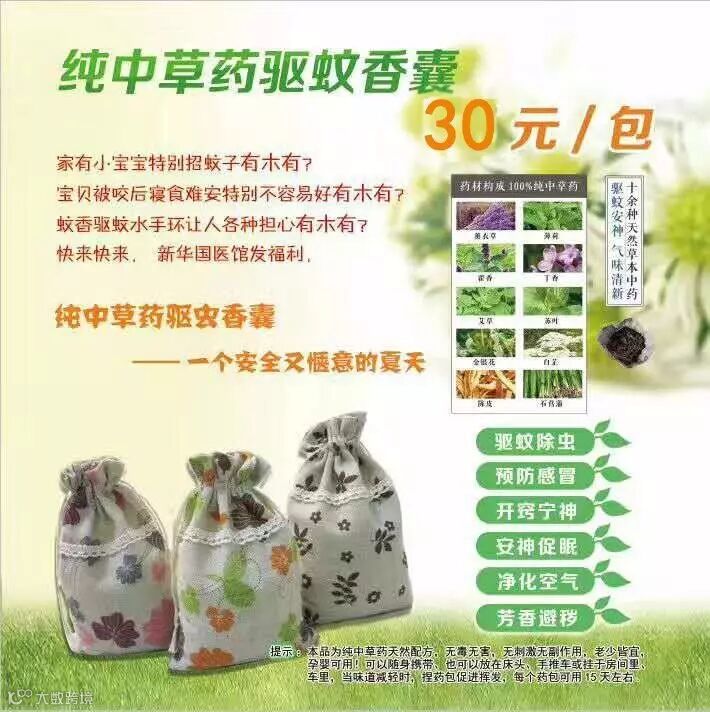 转发集赞28赠送“新华国医馆”提供的价值30元中草药驱蚊香包