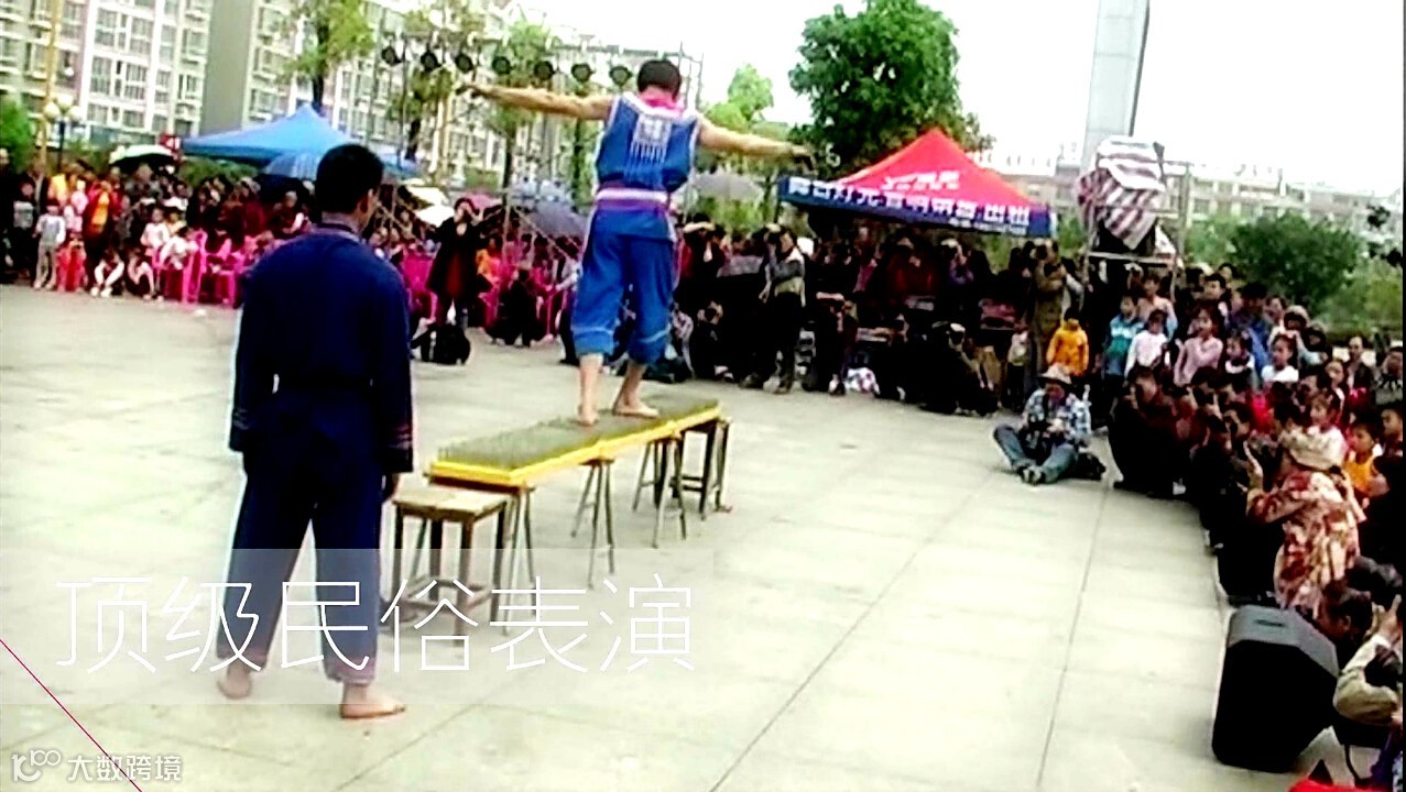 ③4月18、19、20、21日,宜州市北牙瑶族乡民族民间绝技表演队表演古老民间绝技—上刀山、走钉桥、桐子镖、跳火绳、打火球、下火海、抢亲、顶竹等。