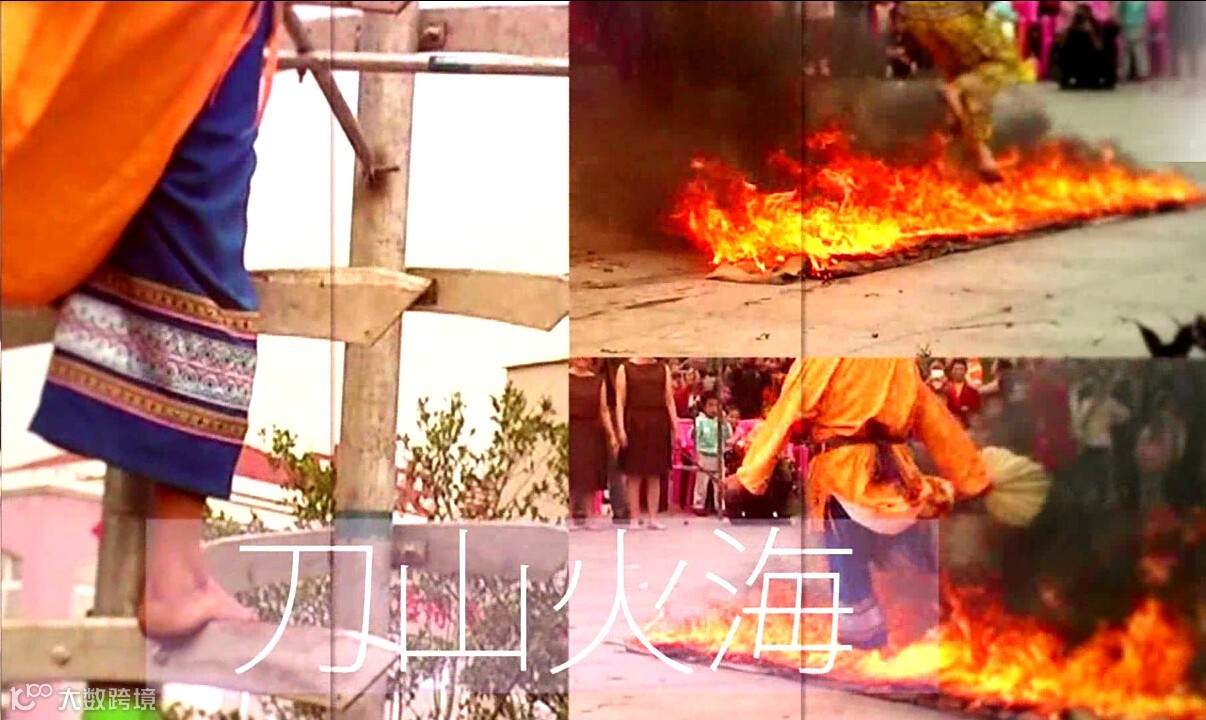 (7)5月1日至3日,广西金秀大瑶山表演团队表演原生态瑶族上刀山下火海节目。