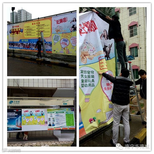 11月9日下午,随着十米长的广告喷绘缓缓拉开,华南城社区周末欢乐行——荣和新城站的宣传攻势也正式拉开序幕。为了给本次社区活动宣传造势,商业管理部的小伙伴们在场地内布置了三十平米的广告轰炸,在社区里贴了五十份A1海报的地毯式宣传,以及覆盖周边小区五千户以上家庭的DM单页发放。