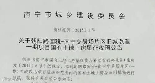 1月17日,南宁市城乡建设委员会办公室发布公告,对朝阳路国税-南宁交易场片区旧城改造一期项目国有土地上房屋进行征收。