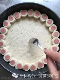 16:在披萨饼边涂一层清水,把香肠饼排列到披萨盘,用叉子在面饼上戳一些小孔