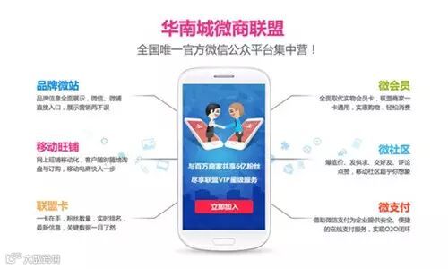 据了解,华南城微商联盟是华南城旗下子公司华南城网专为中小企业打造的一个粉丝共享,相互推广,互惠共赢的移动电商集群平台,除了能给企业带来品牌微站、微会员、移动旺铺、微社区、联盟卡、微支付等技术支持服务,还能给企业官方认证、粉丝共享、全站推广、电商讲堂、行业展会、营销助手六大运营推广服务,一条龙解决企业微信开发难与运营难两大核心问题,帮助企业抢占微信营销市场先机。