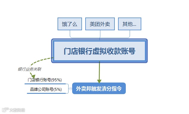 与银行签约的品牌商户,并开通了公司的一般账号。根据收集的各个门店信息生成门店信息和相应的虚拟卡号(与门店实体卡关联),由银行方统一审核并确认清分协议,同时生成一个唯一编号给到品牌方在外卖邦系统进行门店绑定,门店需要提供指定银行的收款银行卡。
