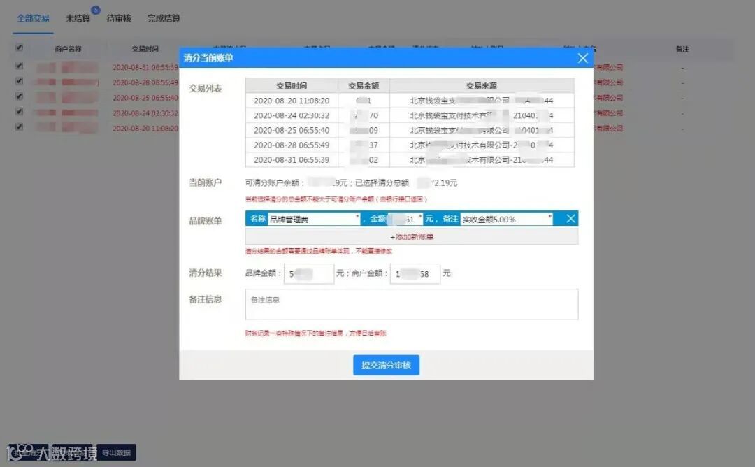 清分功能用于品牌门店财务账目清分结算,通过银行提供的门店虚拟子账号,接收从饿了么,美团外卖,京东到家,饿百零售等的销售款项(当前款项为实际平台打款金额,跟订单统计实收金额没有必然关联,大多数情况两个金额会接近或者相同)。品牌方财务人员通过外卖邦系统设置品牌服务费,系统自动计算打款金额,财务人员最后在外卖邦确认打款。例如品牌方收加盟方5%的品牌管理费,加盟方每笔收入95%,公司银行账号最终实际收款5%,实现公司税费合规化,同时节省财务人员大量的统计打款时间。