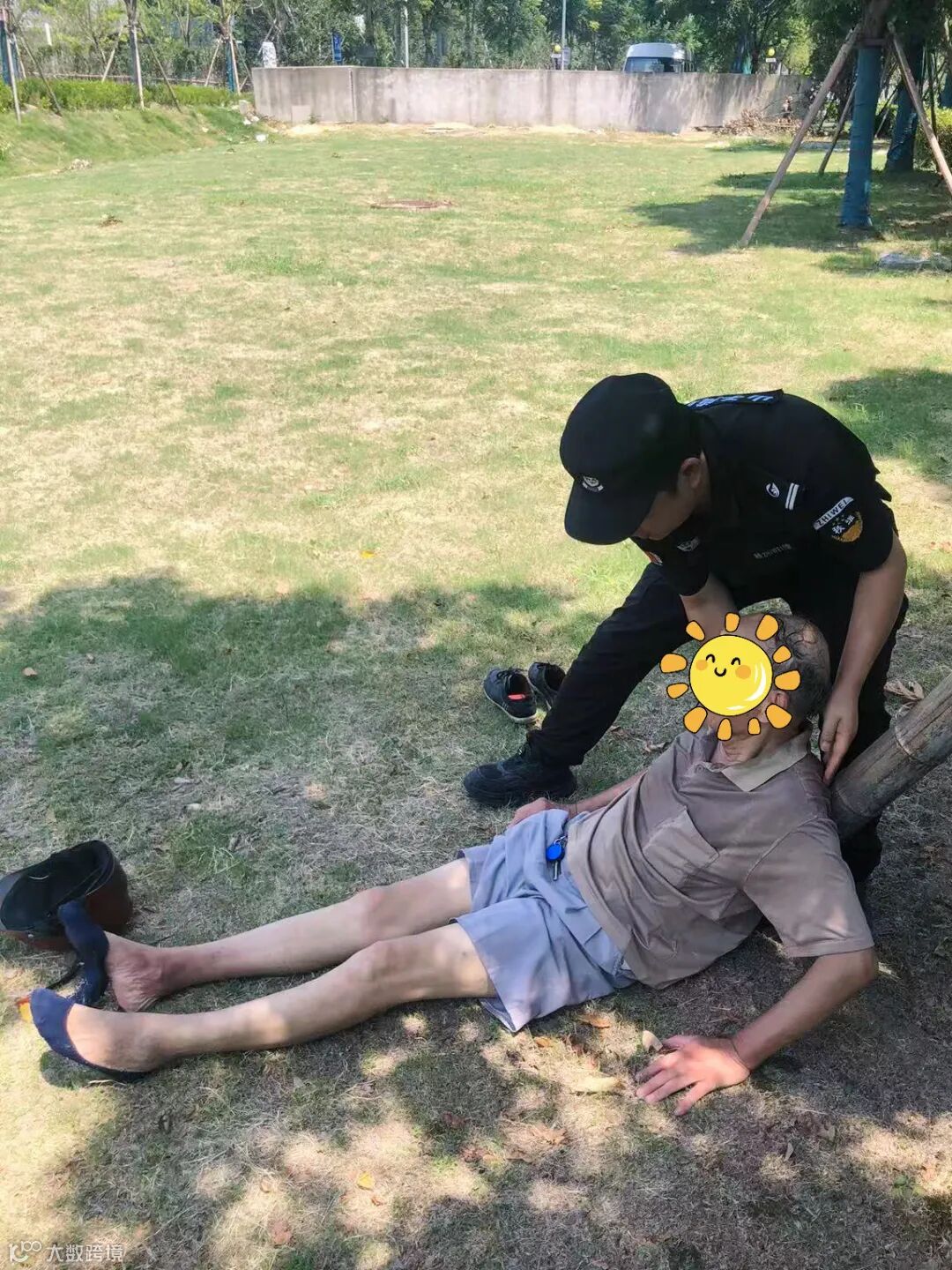 近期骄阳似火,毒辣的太阳炙烤着大地,室外温度一路飙升至40摄氏度,地表热浪滚滚,仿佛连空气都在燃烧。甬水桥科创中心保安员卢永健在例行巡逻时接到园区工作人员提醒,发现一名外来老汉摇摇晃晃地误入园区。老人面色苍白、嘴唇干裂,浑身无力地蜷缩在太阳暴晒的草坪上。见此情景,卢永健立即上前查看,判断老人可能是因为高温中暑,再加上迷失方向,导致体力严重透支。