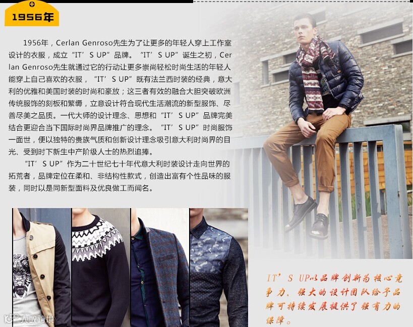 作为中国(大陆地区)顶尖时尚品牌之一IT’S UP更加符合亚洲人体型的版型设计和更具舒适性,以此更是将潮流时尚完美体现。