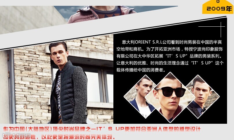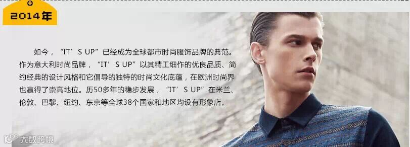 IT’SUP 时尚男装以其精工细作的优良品质、简约经典的设计风格和它倡导的独特的时尚文化底蕴,在国际时尚界赢得了崇高地位。