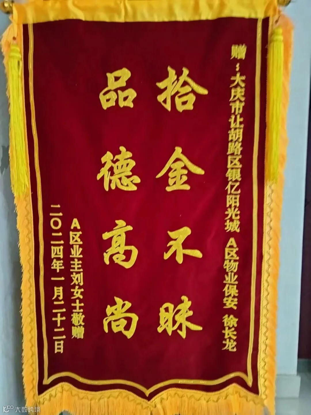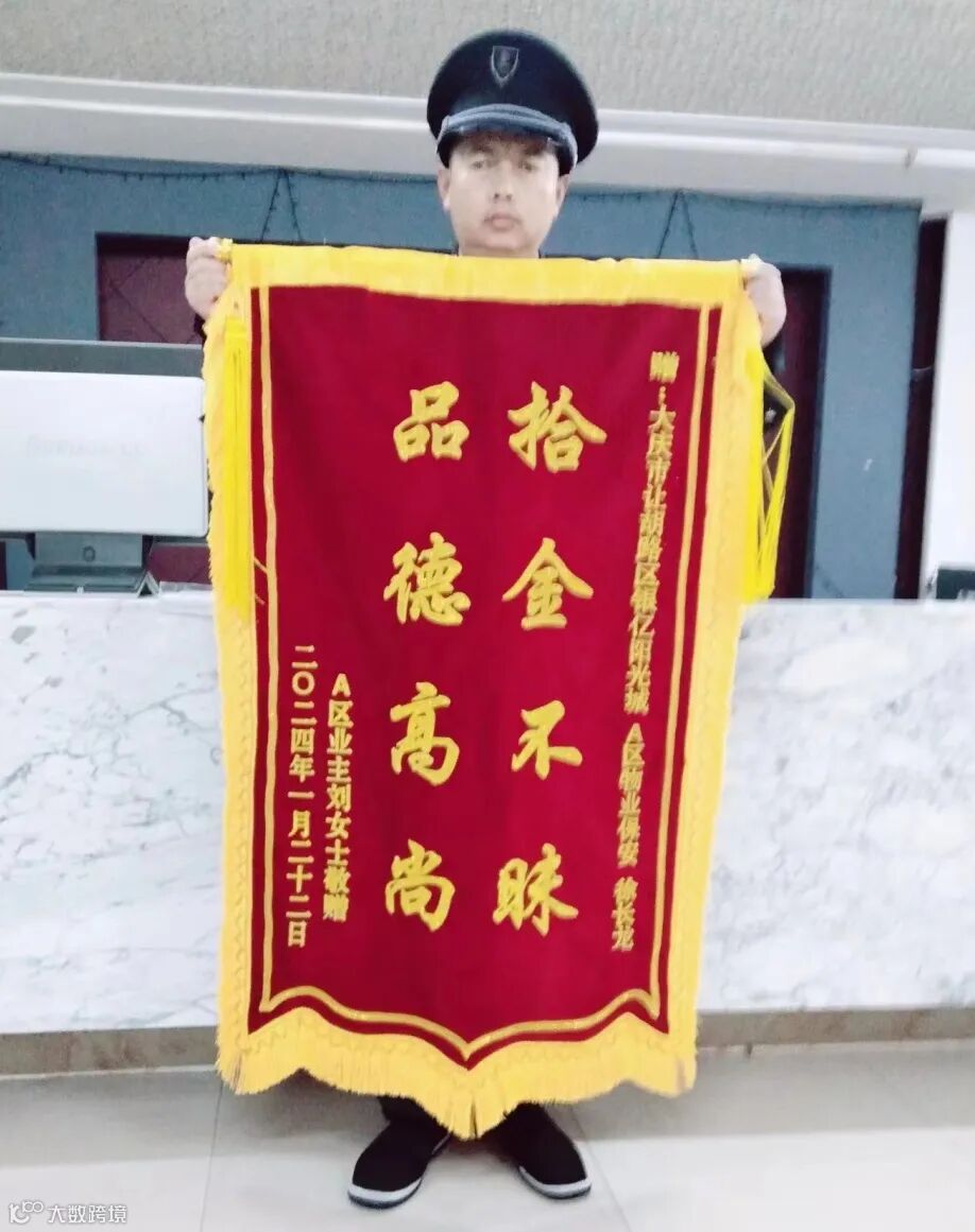 2024年1月23日,银亿物业大庆公司收到了一面来自“刘女士”送来的锦旗,锦旗上面金灿灿的几个“拾金不昧”的大字显得格外醒目,业主对物业工作人员尽职尽责,诚实守信的工作作风和高尚的职业道德表示感谢。