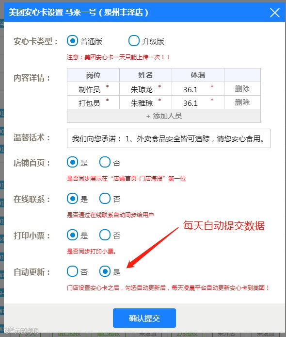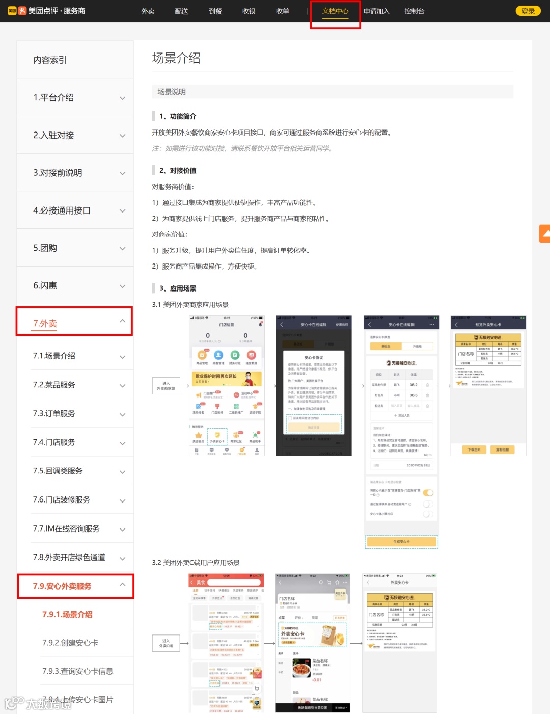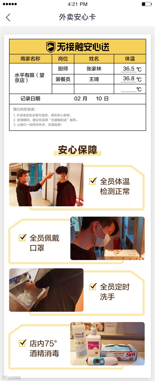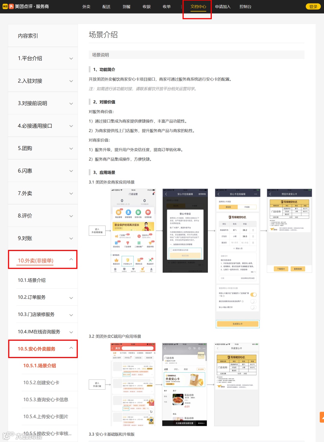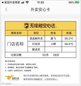 为提升用户对外卖的信任度,平台开通安心外卖功能接口,商家可在完成商家承诺书线上签署后,通过服务商对接接口调用创建、上传安心卡、查询安心卡信息,并将安心卡在c端进行专属标签展示,同时可支持安心卡随小票打印及订单完成后通过IM自动发送安心图片给C端顾客。