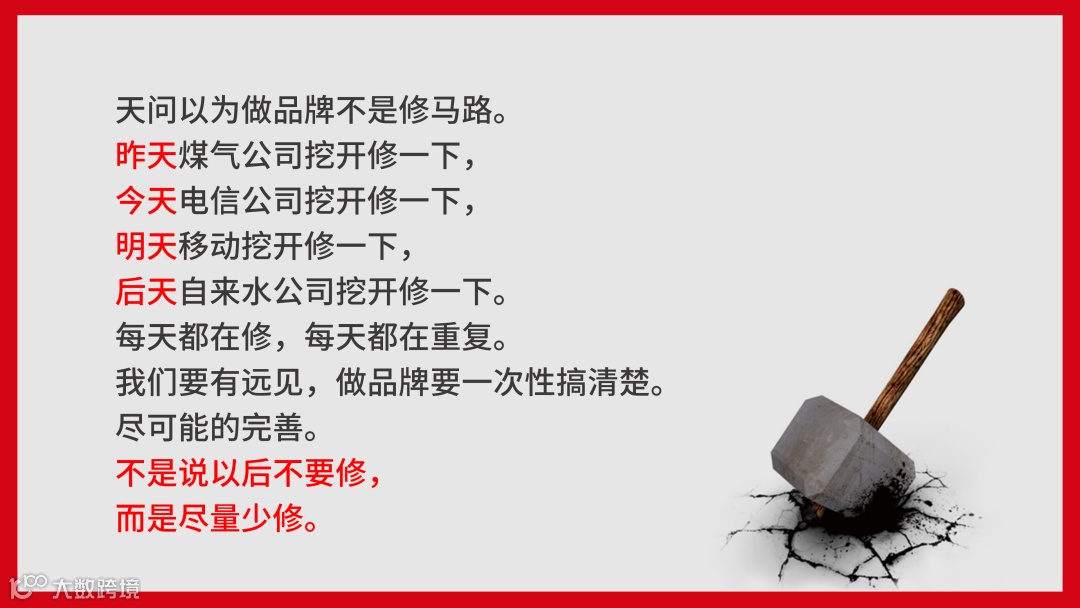 在我眼里,做品牌不是修马路,要一次性搞好,而不是不停的开挖。把一个东西反复搞比较容易,关键是要具有长远性,具有真正意义上的战略性思考,然后从细节入手,把一个东西做到简单。