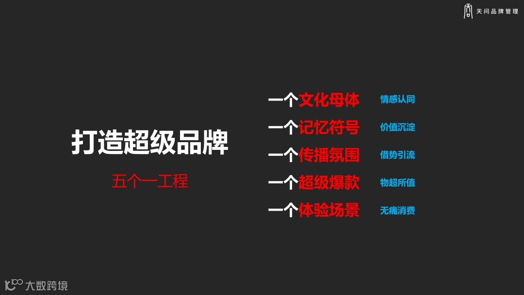 相比国内各种品牌营销体系,天问是基于五个事情去思考品牌的。我们有3个五个一工程:超级品牌的五个一,超级爆款的五个一、品牌形象的五个一。
