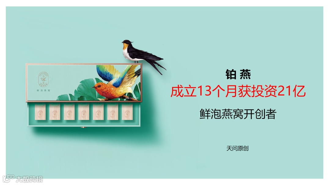 「铂燕」是天问2020年起全案服务的客户,成立13个月就获得融资21个亿,最近又获得了几个亿的投资。它改变了国内燕窝全面、大量下滑的局面,甚至辛巴事件之后,全民对燕窝充满怀疑的情况下,铂燕依然在增长,在资本市场很有价值。