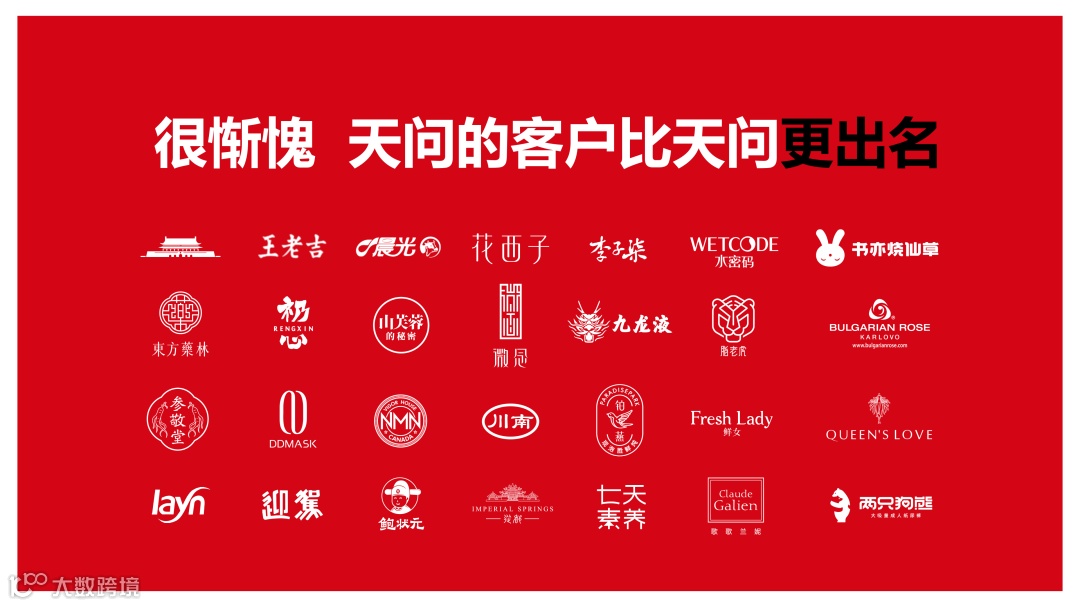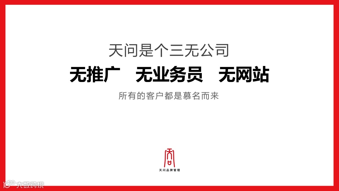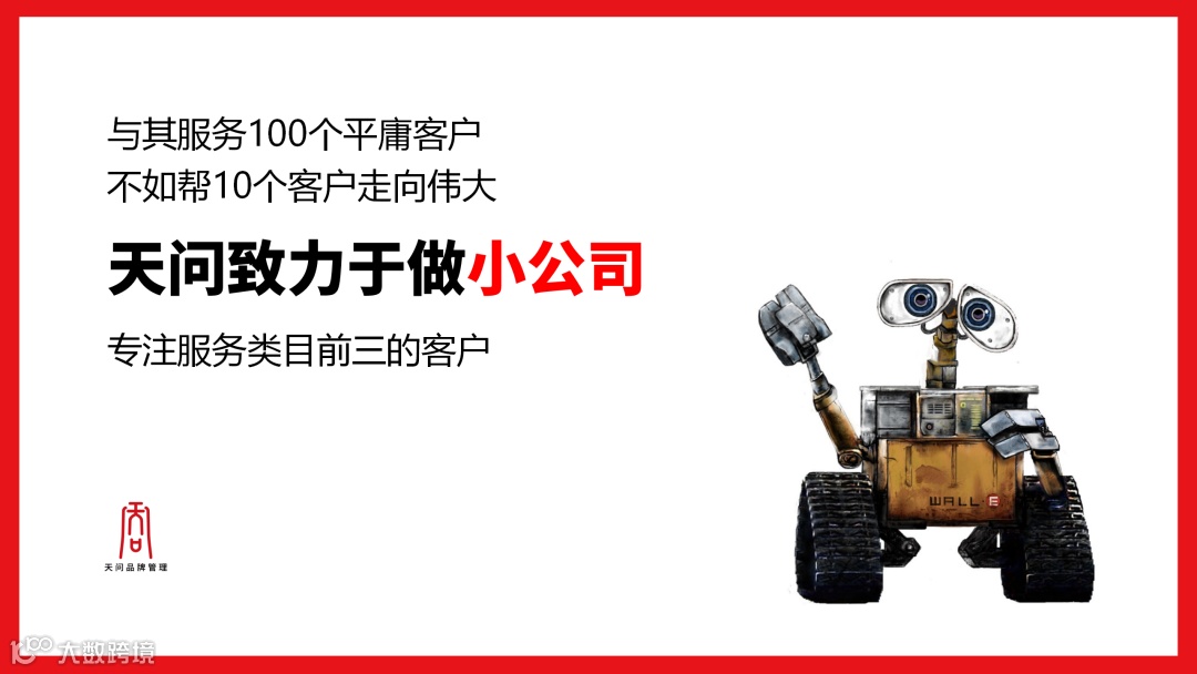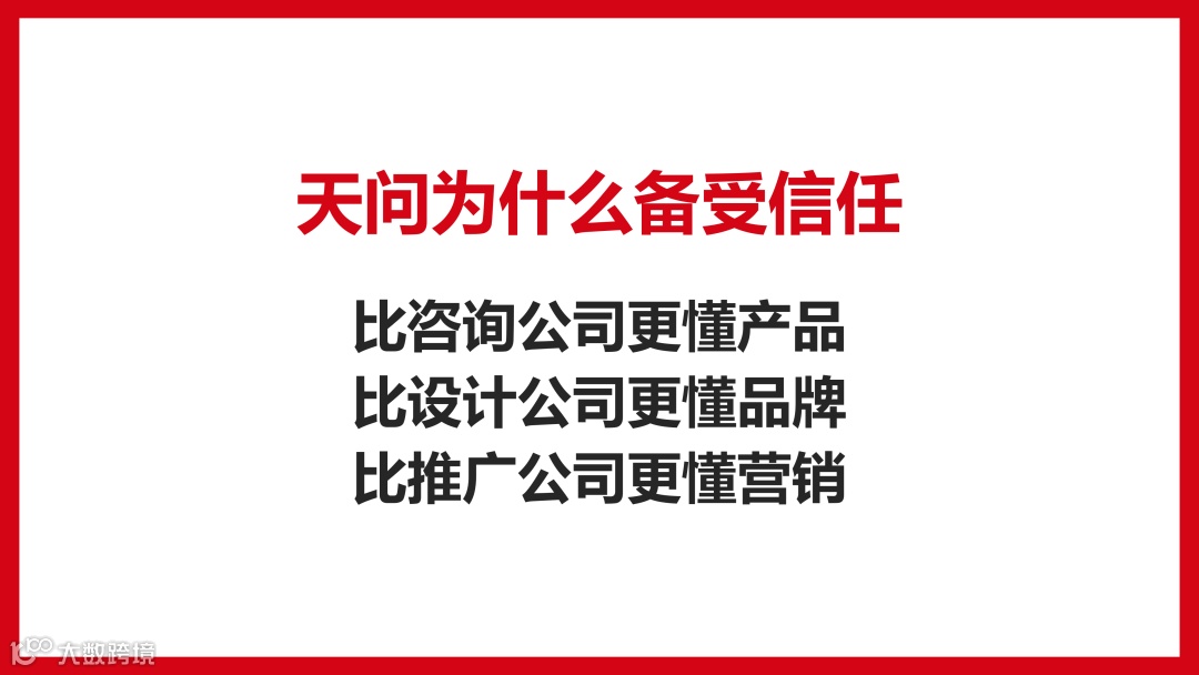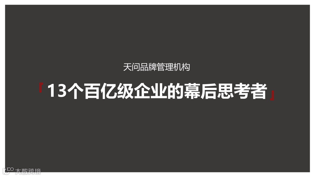 天问长期有一个核心标签,在四年前使用的是「17个十亿级企业的幕后思考者」。后来我们有些客户成长到百亿级了,有些是几百亿了,就把它调整为「13个百亿级企业的幕后思考者」了。