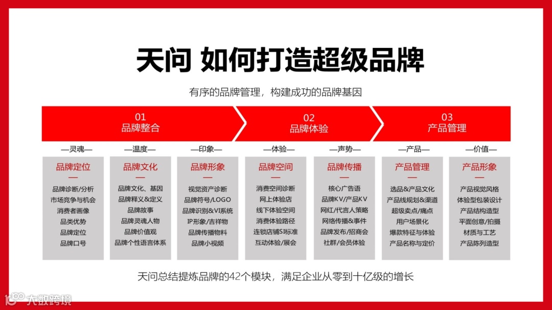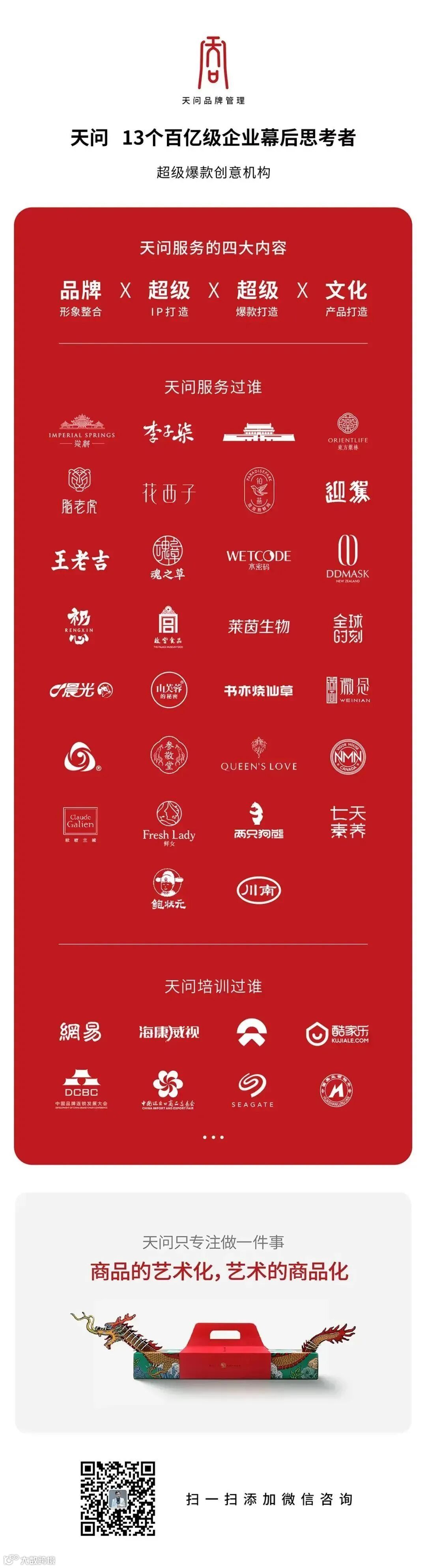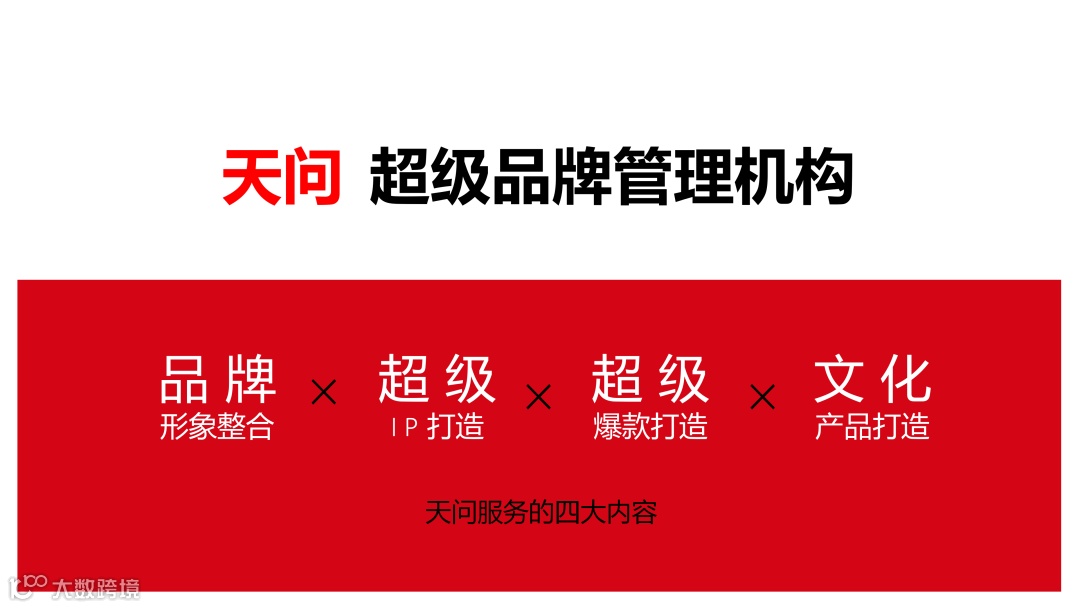 我给天问的定义是「超级品牌管理机构」,我们的服务包括四大内容:品牌形象整合、超级IP打造、超级爆款打造、文化产品打造。