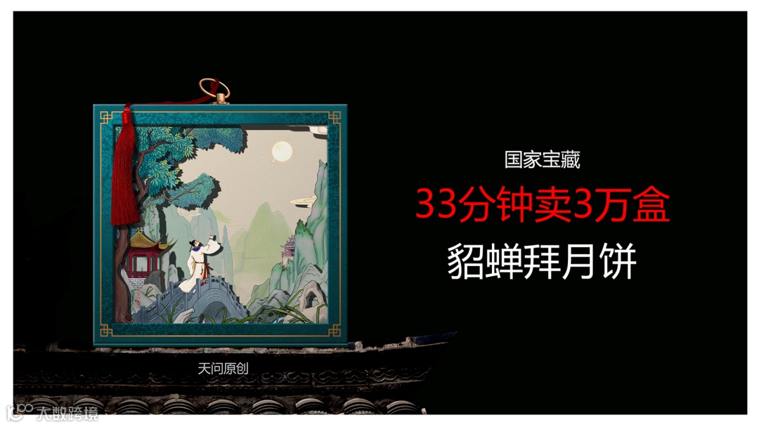 天问打造了李子柒的第一款月饼「貂蝉拜月饼」,这款产品获得了国家宝藏的联名,33分钟卖了30000盒,1小时卖了50000盒,开创了国内月饼最快的销售纪录。