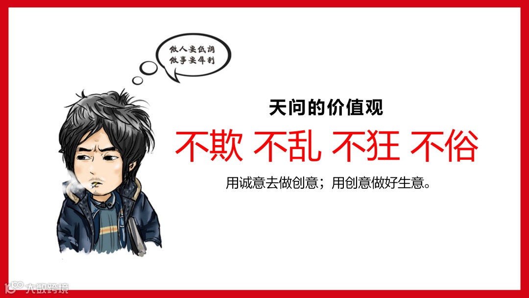 很多人可能不太知道天问,大部分人是通过朋友介绍、boss直聘和包联网找到我们,所以我们经常会面临一个关于“标签”的问题:你们是干什么的?你们是广告公司吗?你们是设计公司吗?你们做推广吗?然后我会花大量的时间,尤其是招聘的时候去向别人解释我们是谁。