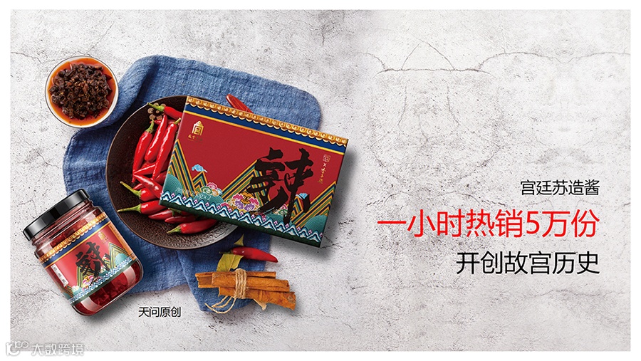 「故宫苏造酱」是开创了故宫历史的一个辣酱,一小时热销5万份,这个产品在盒马鲜生常年卖断货。当所有人都在用皇帝卖萌的时候,我们采用故宫城墙元素、海水纹元素。