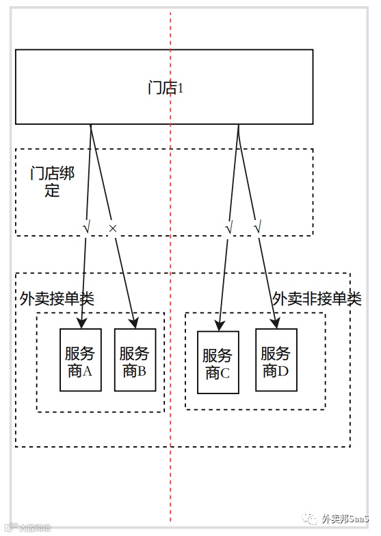 1.2.门店在进行「外卖非接单类」业务绑定时,可以同时绑定多个服务商。在符合门店绑定的基本逻辑下,需注意以下几种场景: