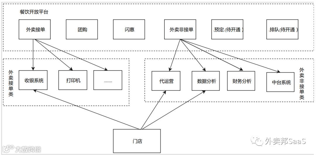 举例:商家H已绑定收银系统服务商A,前期代运营服务商B只能通过其他方式提供服务或放弃该客户,开放【外卖非接单类】业务后,代运营服务商B可以直接绑定商家H,通过开放平台提供的接口向商家H提供服务。