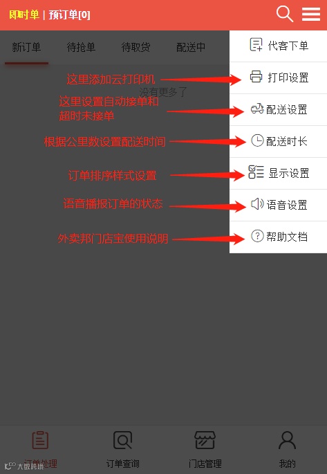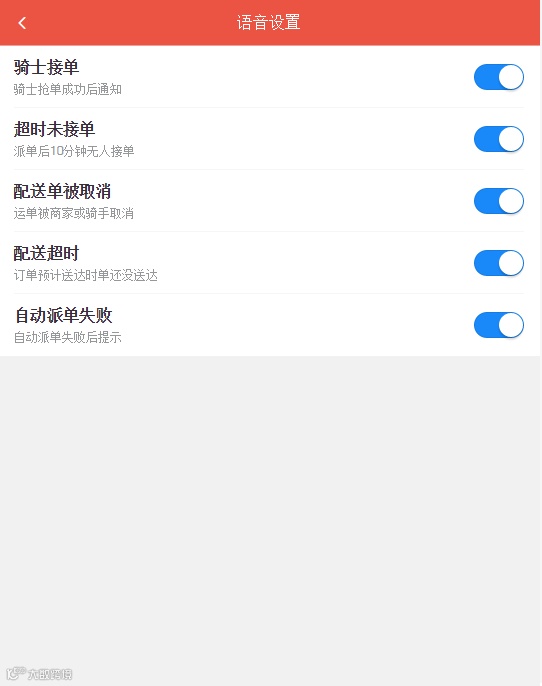 在新版本的外卖邦中,我们增加了语音包,主要是为了方便商家的使用,当接单后、超时未接单、配送被取消、配送超时以及自动派单失败都会有一个语音提示,以便及时通知商家订单的实时状态。