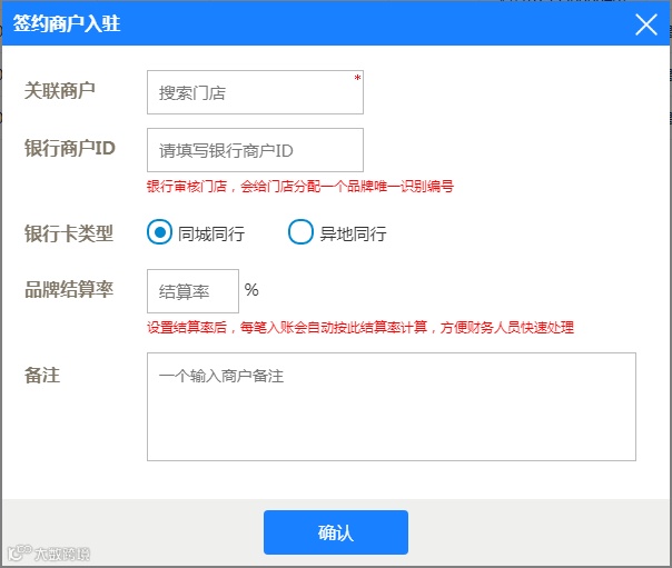 与银行签约的品牌商户,并开通了公司的一般账号。根据收集的各个门店信息生成门店信息和相应的虚拟卡号(与门店实体卡关联),由银行方统一审核并确认清分协议,同时生成一个唯一编号给到品牌方在外卖邦系统进行门店绑定,门店需要提供指定银行的收款银行卡。