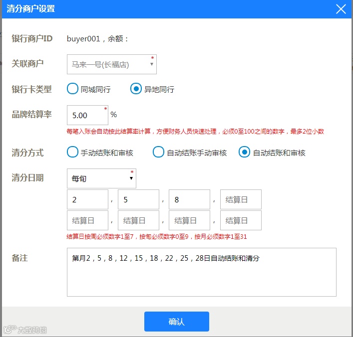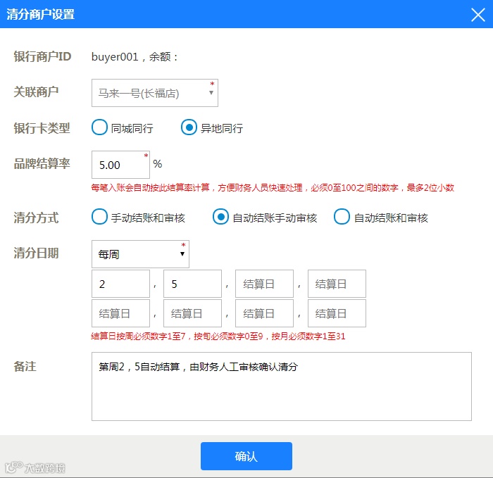 清分功能用于品牌门店财务账目清分结算,通过银行提供的门店虚拟子账号,接收从饿了么,美团外卖,京东到家,饿百零售等的销售款项(当前款项为实际平台打款金额,跟订单统计实收金额没有必然关联,大多数情况两个金额会接近或者相同)。品牌方财务人员通过外卖邦系统设置品牌服务费,系统自动计算打款金额,财务人员最后在外卖邦确认打款。例如品牌方收加盟方5%的品牌管理费,加盟方每笔收入95%,公司银行账号最终实际收款5%,实现公司税费合规化,同时节省财务人员大量的统计打款时间。