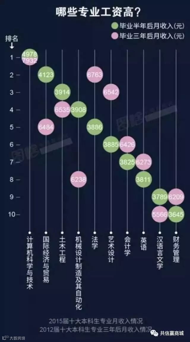 数据还显示,即使从2012届学生毕业三年后月收入来看,在本科十大专业中,计算机科学与技术专业的毕业生依旧保持领先优势,月收入达7932元。而同届同等学历财务管理(毕业半年后:3645元,毕业三年后:6209元)和汉语言文学(毕业半年后:3789元,毕业三年后:5566元)专业毕业生的月收入相对较低。